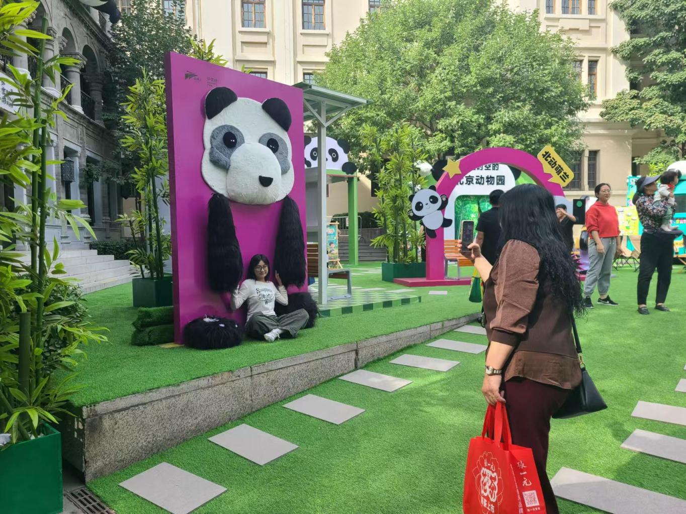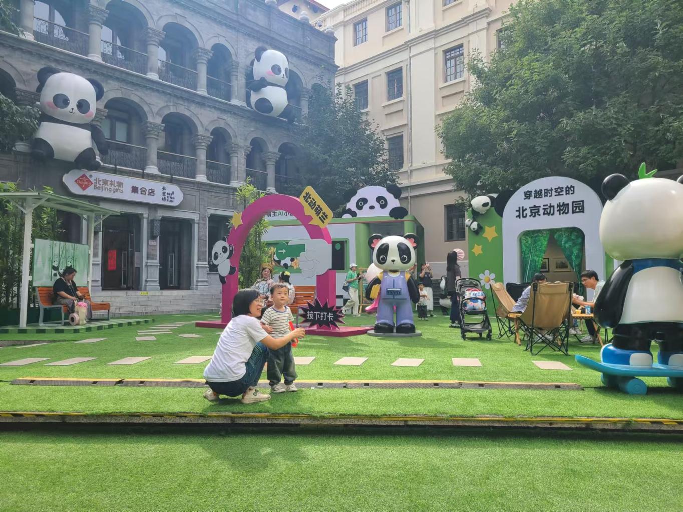 “妈妈快看,是大熊猫,太可爱了!”走进北京坊东广场的主题乐园,首先映入眼帘的便是正在播放“萌兰”动态视频的大屏幕。屏幕上的“萌兰”或挥手打招呼,或攀爬树杈,或趴着打哈欠,一举一动都分外可爱,引得现场的大人小孩直呼“太萌了”。乐园里随处可见趣味满满的熊猫主题布景,游客们坐在四肢毛茸茸的熊猫脚边、蹲在熊猫玩偶旁纷纷打卡留念。